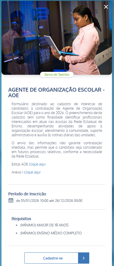 AOE-Banco de Talentos Enviar por e-mail EDITAL DE 26/12/2025 – BANCO DE TALENTOS AGENTE DE ORGANIZAÇÃO ESCOLAR – AOE Edital ANEXO I – AUTODECLARAÇÃO PARA FINS DE PONTUAÇÃO DIFERENCIADA ANEXO I Acesso a Inscrição: Inscrição